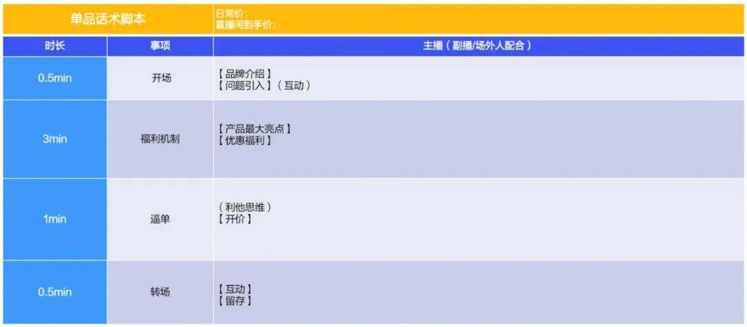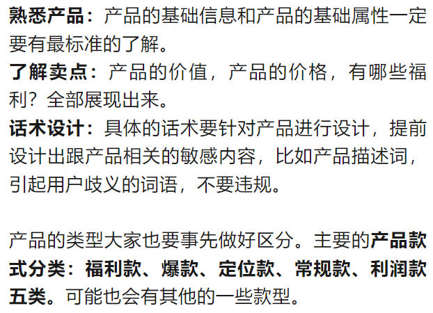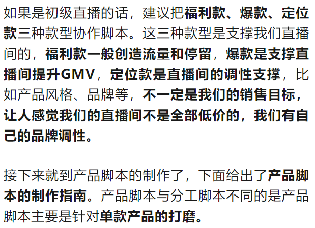 产品脚本是解决了解产品的一个关键的点,先做一个简单的产品脚本,对产品有一个基本了解。使用福利款、爆款、福利款、爆款这种玩法,也就是ABAB玩法,更适合刚开始起步的新手期团队,能够让主播快速掌握直播节奏和了解产品。