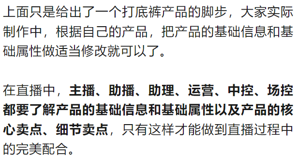 哪怕主播对产品不了解就是通过背也能把话术背清楚,这样就能够把一个产品介绍的非常清楚。因为针对的是新手主播和副播,会运营小编建议大家把单品话术写的很详细一些,尤其考虑到主播和副播怎么配合的话术也写清楚。