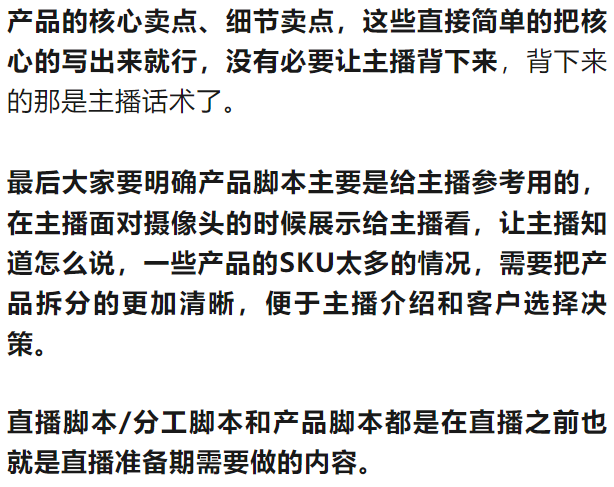 以上三点都是需要我们在直播中需要明确的,那么这三点:明确细节、明确分工、明确节奏也是我们直播脚本的核心要点。