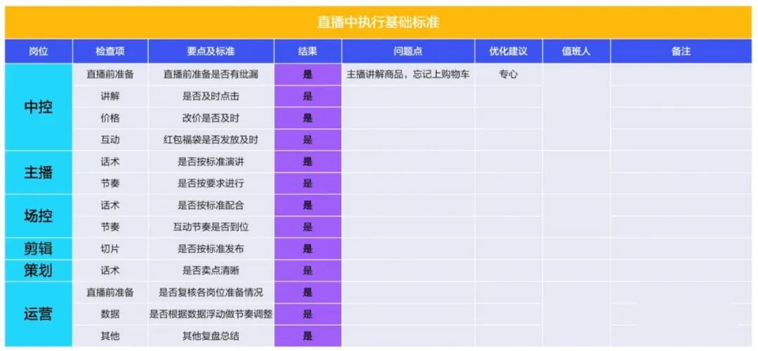 同样写脚本的原则也是对应地解决上面的问题。成长期直播团队首先要做到的就是监督执行的评估脚本,用来评估整体直播效果和环节。这个脚本由运营或者直播负责人制作,主要监督各个岗位出现的问题,以及各个岗位搭配的问题。