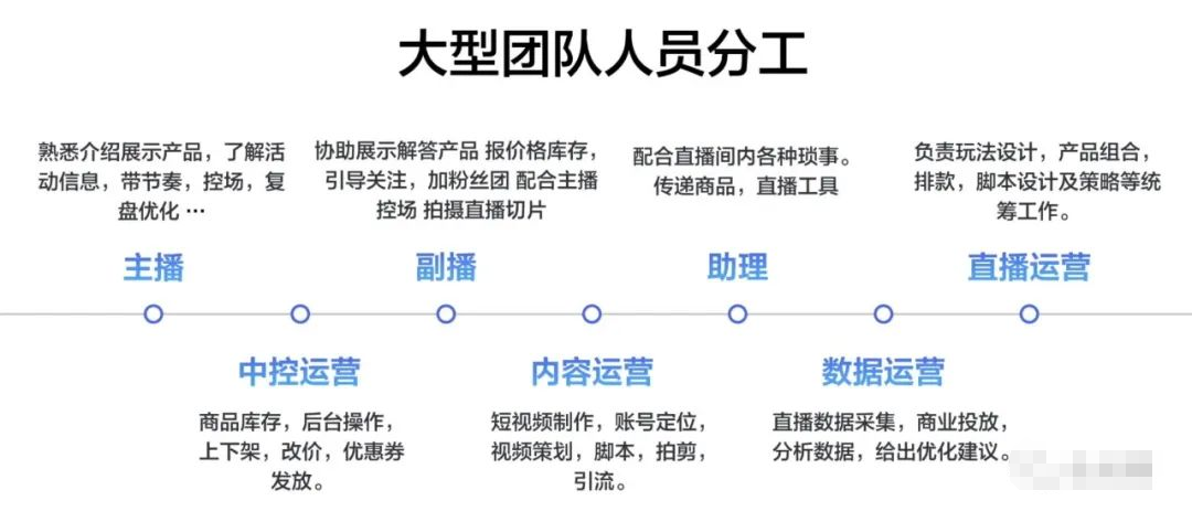 然后还要明确一个直播团队的分工,分工明确才能完成一场带货直播。