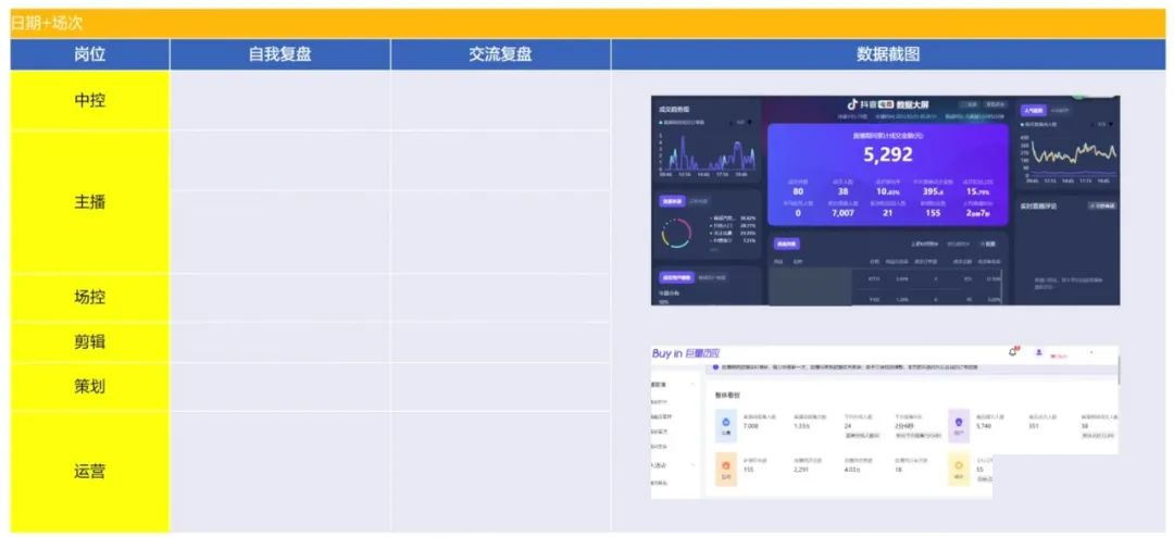 复盘脚本:还是按照每个岗位复盘,结合数据进行复盘。可以看录像发现数据问题,然后根据岗位解决问题。