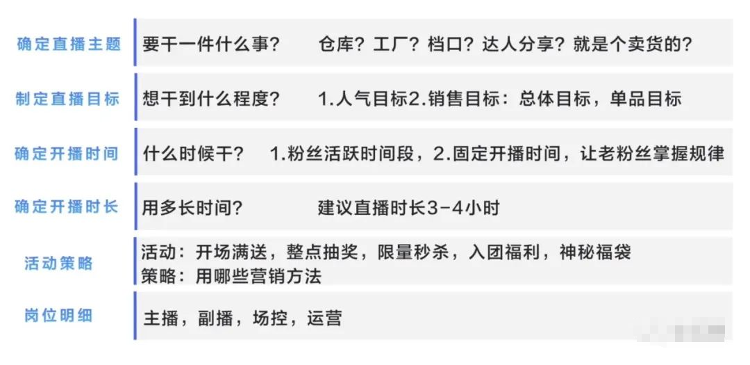 明确分工:人员如何分工,明确各个岗位需要做的事情,明确采取什么样的互动方式,哪些人需要跟观众产生互动,这些互动又是怎么做的。