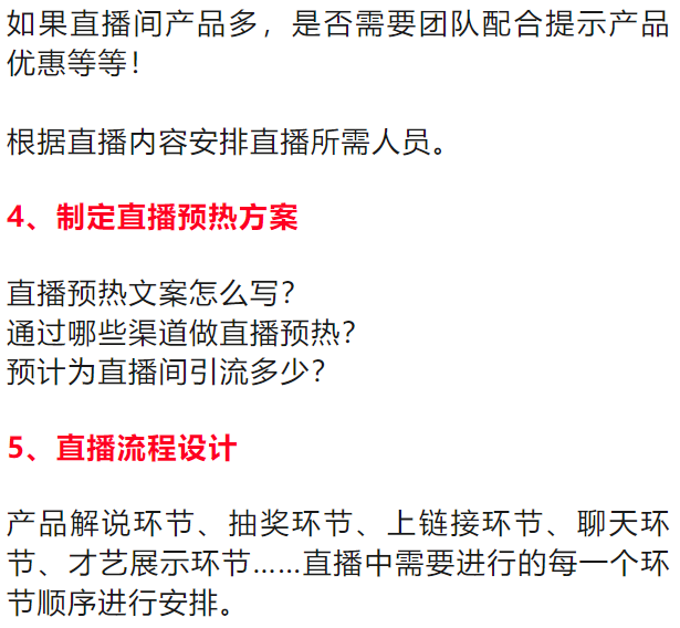 我们需要设计的内容包括:直播时间、直播设备、选品、直播主题、主播、注意事项、预热、话题引入、促单话术等等。