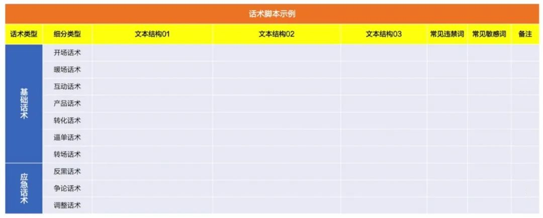 话术脚本分为基础话术和应急话术。基础话术包括:开场话术、暖场话术、互动话术、产品话术、转化话术、逼单话术和转场话术。应急话术包括:反黑话术、争论话术和调整话术。