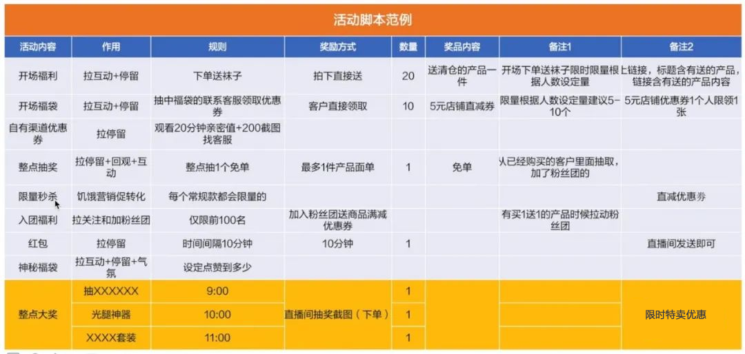 活动脚本主要是在我们规定的直播节奏中嵌入对应的活动,能够保证在这个时间点有一定的人气积累,能够提升互动停留以及关注等辅助作用。提升直播间GMV活动虽然起不到主要作用,但是对直播间人气是很重要的,所以我们一定设计好活动脚本。