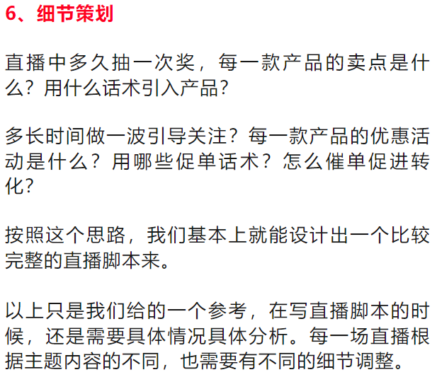 一场直播脚本策划的是产品、直播话术、直播人气、直播转化等,涉及到几个小时直播的每一个环节。