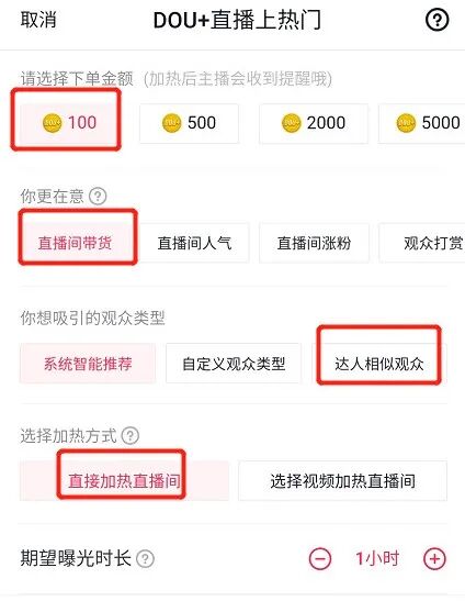 给直播间打标签,尽量选择直接加热直播间,然后选择5-10个同类目带货量比较大的对标账号,同样,也是一百一百的小颗粒投放,一个小时100;