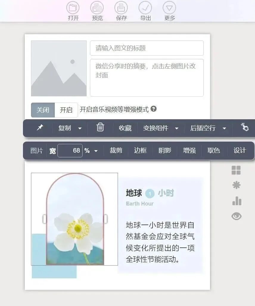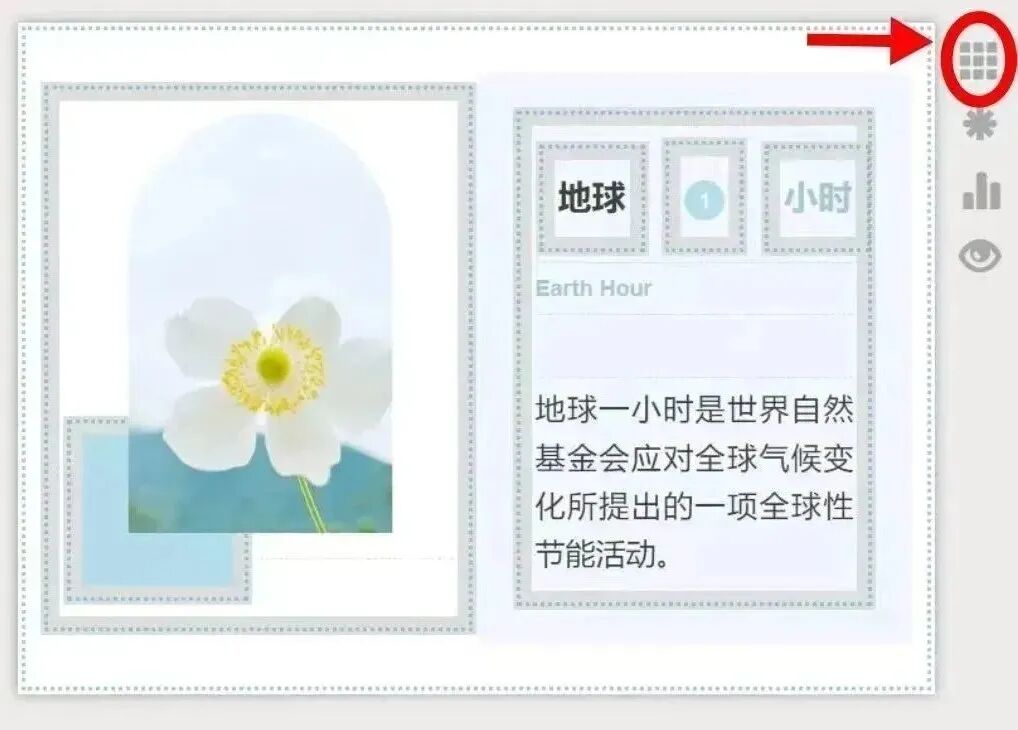 如果在面对更加复杂的图片模板时,只需点击编辑区右侧第一个图标,打开“布局模式”,即可进行更加精细化的排版操作;