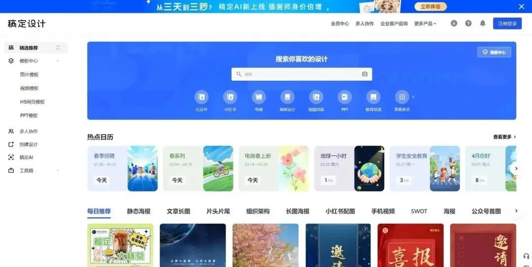 稿定设计也是一款在线设计神器,可以在线快速进行图片和视频编辑,不会PS也能轻松搞定设计。海报、简历、PPT、公众号配图、电商等海量模板快速出图,同时也有海量正版授权资源供你挑选。