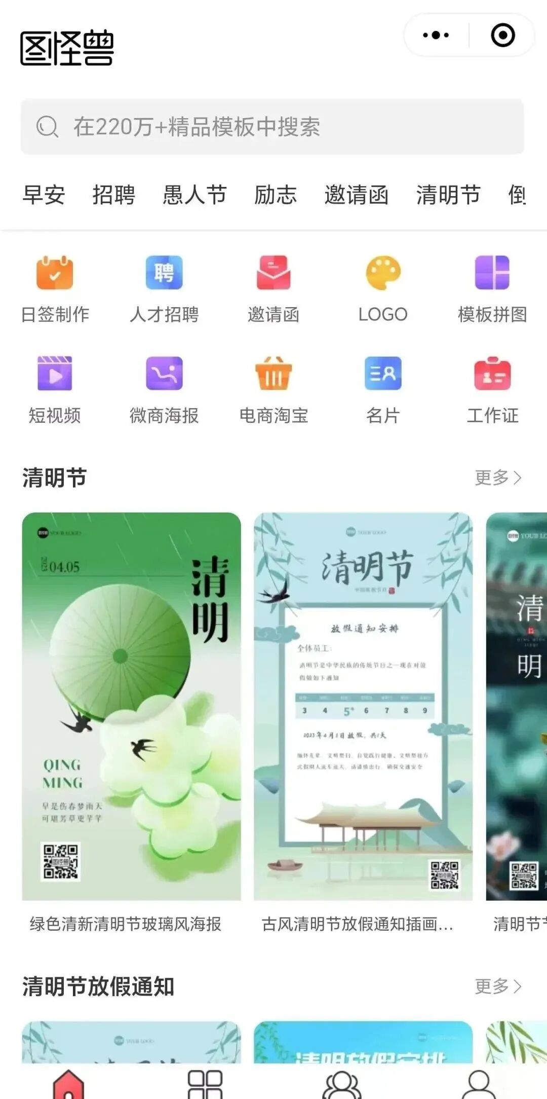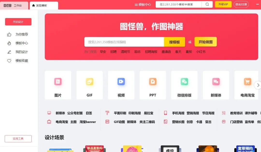图怪兽是一款在线图片编辑服务平台,提供图片模板元素,用户通过替换修改文字来完成图片设计。其操作方式简单,且模板作品可以保存云端,在网页端、微信小程序都可以畅快使用,随时随地完成设计。
