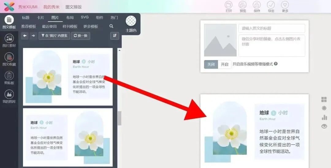 在编辑区已经准备好的模板中,单击选中需要被替换的默认图片,再次点击左侧需要使用的图片,即可完成简单的图片模板的使用;