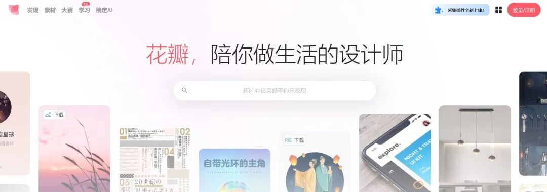 花瓣拥有超过40亿的设计相关内容可供探索,你可以关注你感兴趣的用户、画板和来源网站,收藏你喜欢的作品。花瓣还提供海量的可商用素材,满足你的设计需求。