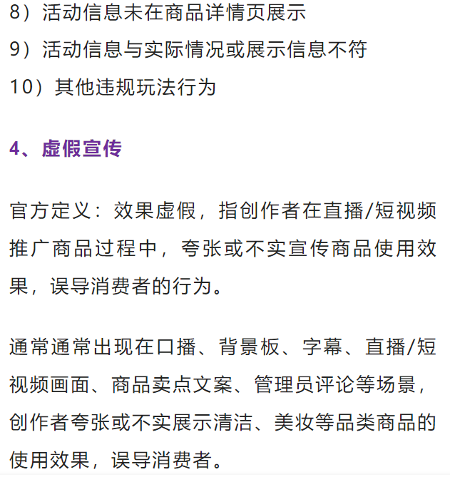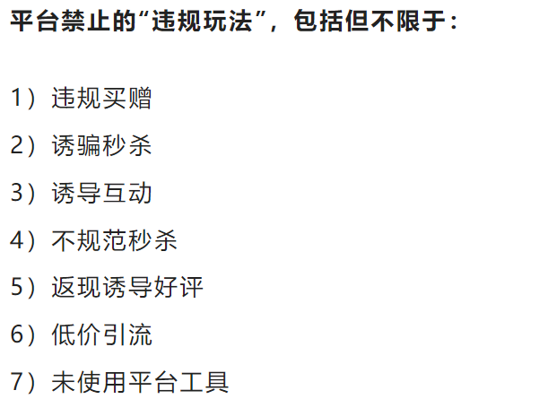 官方定义:平台规则所禁止的违规玩法包括创作者宣传“低价秒杀”、“免单返现”、“买赠”、“抽奖”等福利信息诱骗用户参与,实际未兑现、无法兑现或违反法律法规、平台规则的违规营销内容。