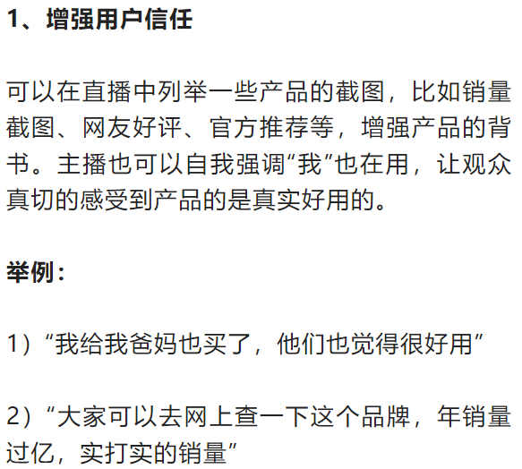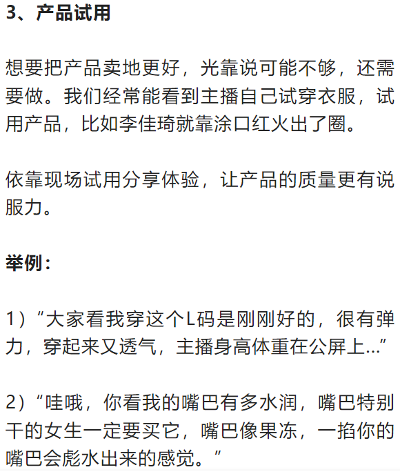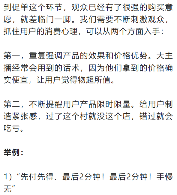 无论哪一个流程,一般有固定的单品讲解流程:卖点引出(2分钟)、手拿介绍(3分钟)、用户评价(3分钟)、促单销售(3分钟)