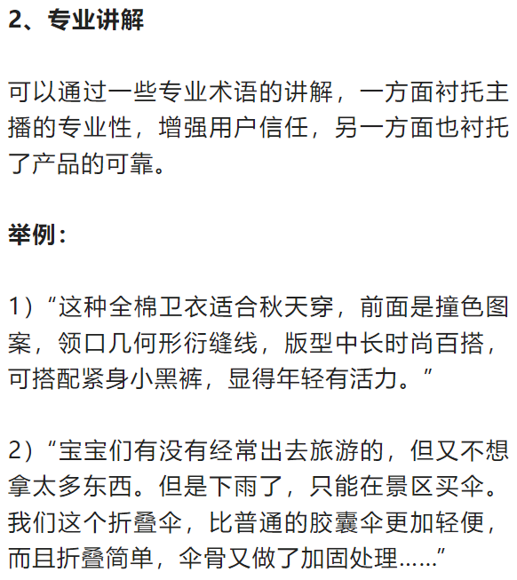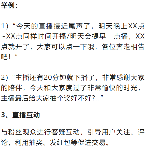 固定直播话术、互动话术、促单话术、商品介绍话术(痛点-痒点-卖点-价格-售后)。需提前了解直播规范,确保直播过程中话术符合直播规范。这点重点讲下: