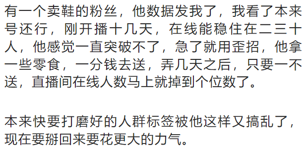 因为告诉后你直播间进来很多不相干的人,本身新号开播直播间的人就不多,里面又进进出出一堆不相干的闲杂人等,影响系统给你的直播间打标签,进而影响直播间的其他数据,最后导致推流越来越少,百害而无一例。