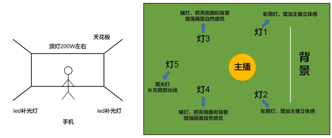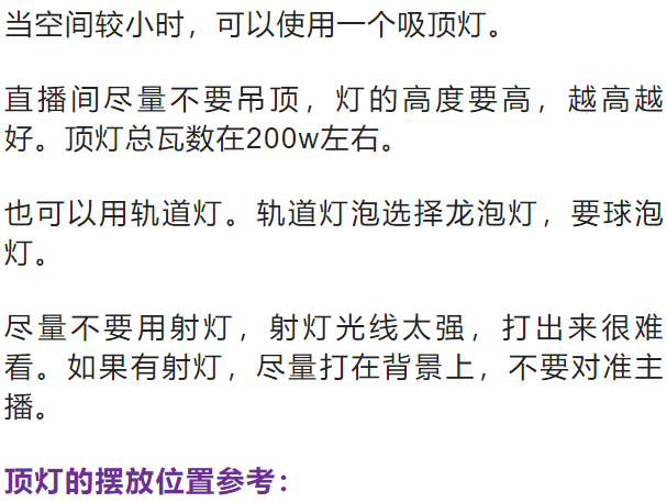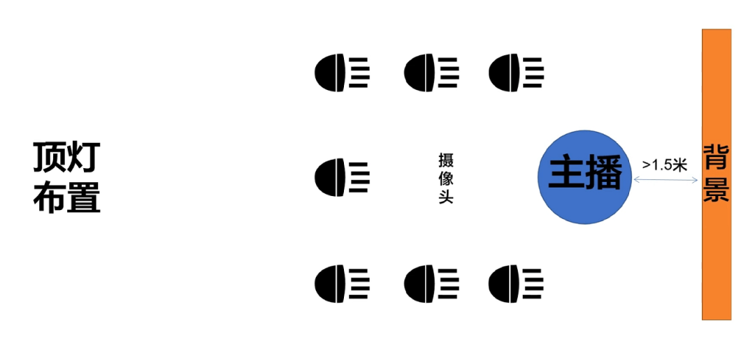 顶灯可以把直播间整个场景照亮,左右灯光负责增加人物和产品的立体感,卖什么产品,打什么样的灯的配置。