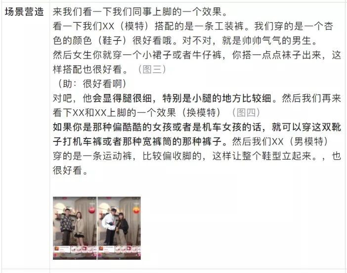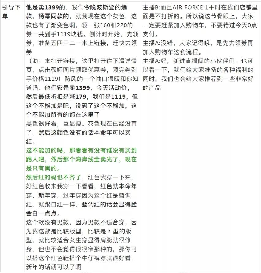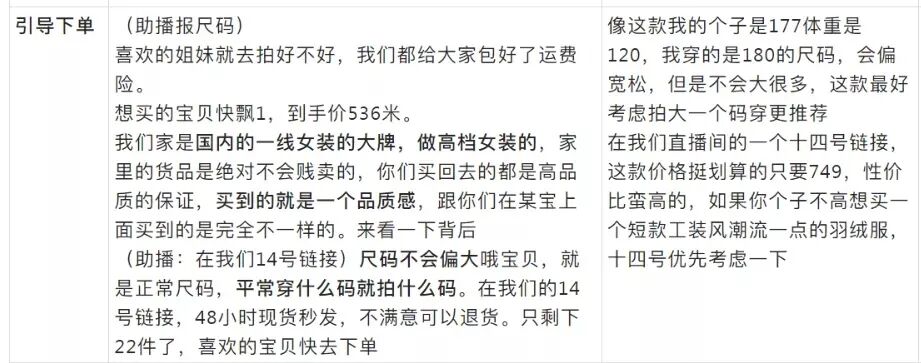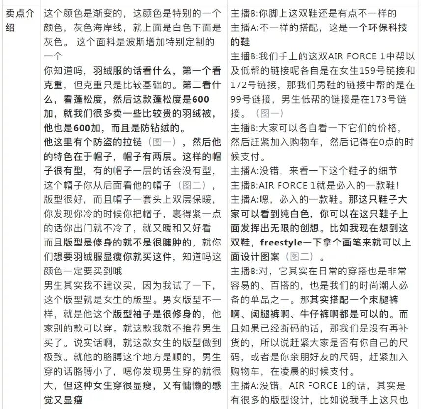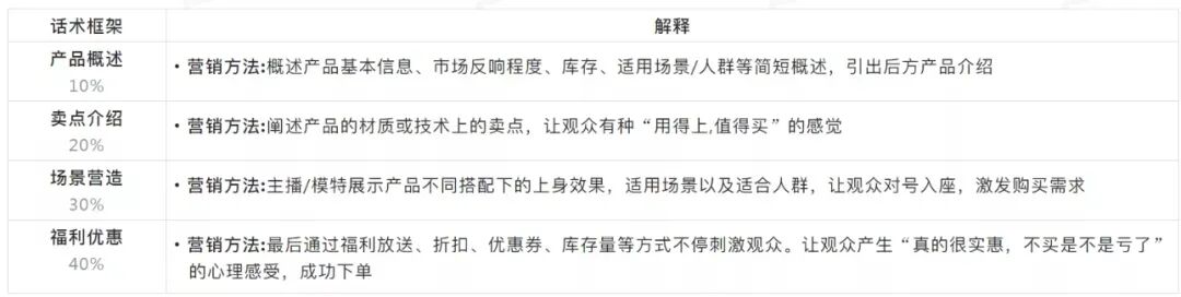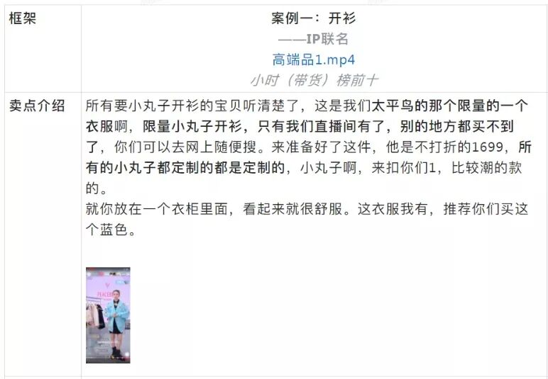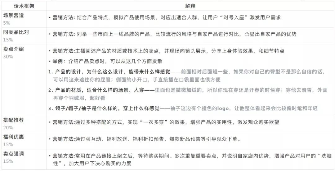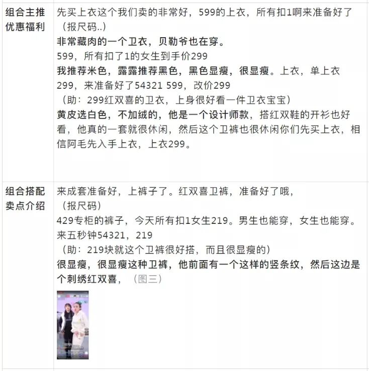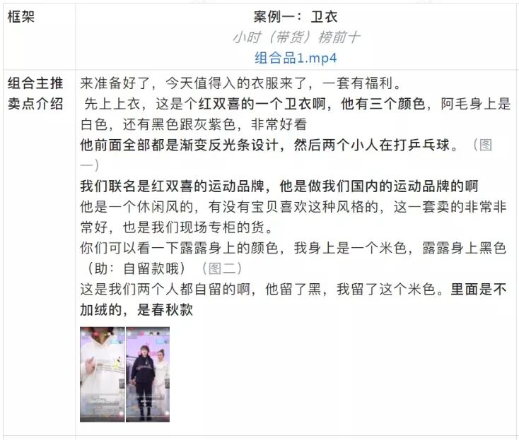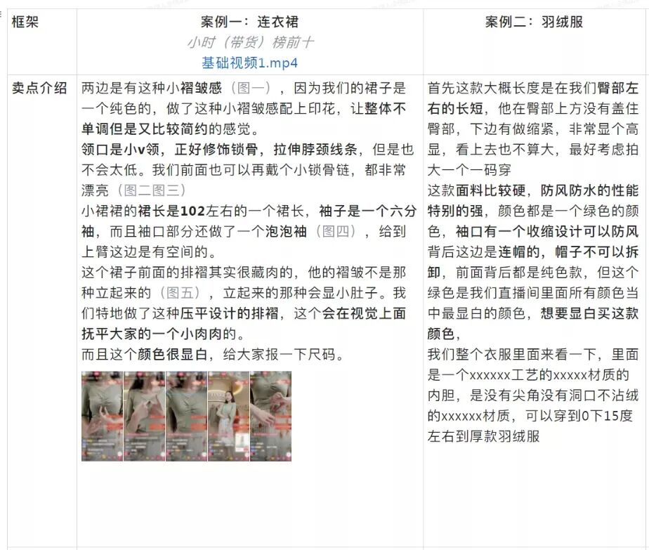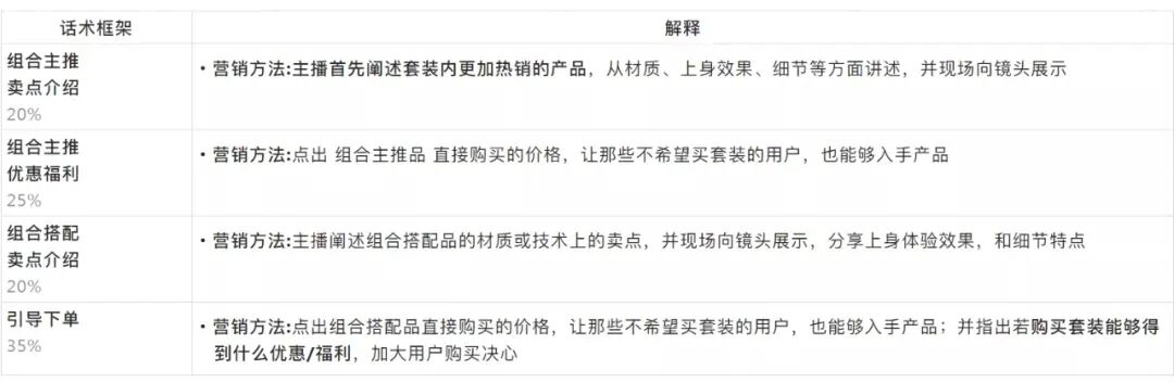 适用场景:商品自身以及价格存在优势较小,常利用品牌背书、店铺优势来推动购买。但基础品介绍部分和组合套装本质相似,都是以介绍产品特点、上身展示为主,整体话术偏短但是产品部分讲解细致。