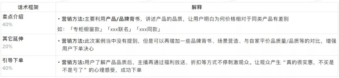 适用场景:品质较好、客单价相对于自家其它产品较高,讲述时会利用产品、品牌背书介绍产品,内容侧重产品的品质,并反复提及。