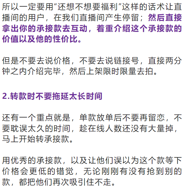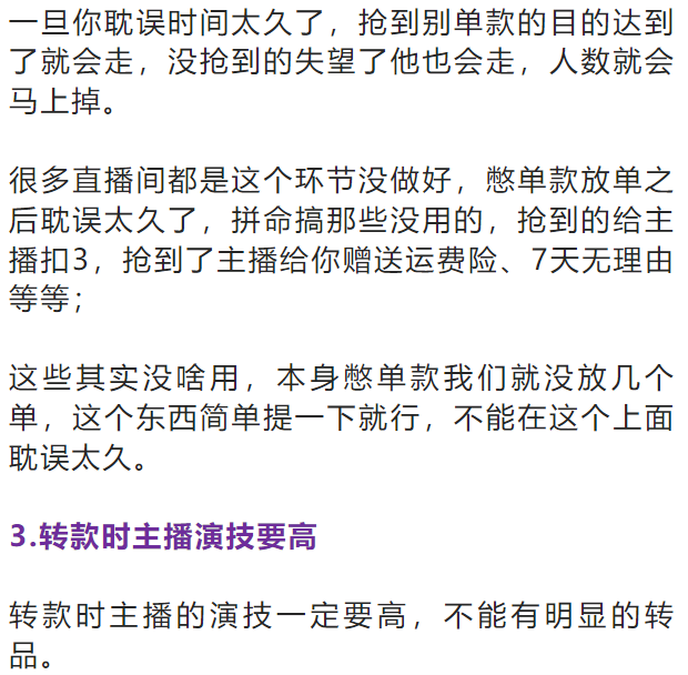 所以你在憋单款放单完毕的那一刻,其实还是有大量的新人涌入进直播间的,此时你转款逻辑转化对的话,这几千的人他们并不知道前面发生了什么,一看你的直播间互动的这么火爆,扣屏这么热烈,而且看主播讲解的这么有激情,他们误以为这里在搞什么大促,他们就会买你介绍的东西,而此时你介绍的正是你的承接款。