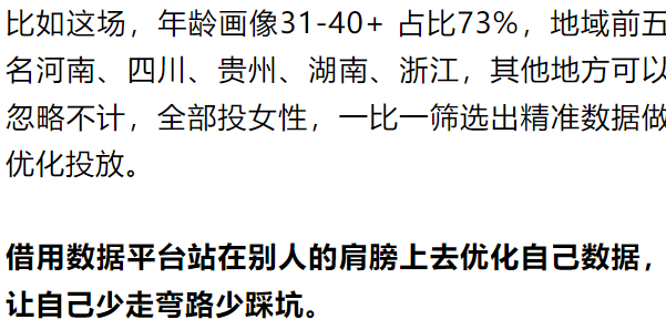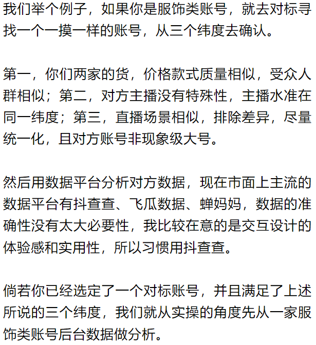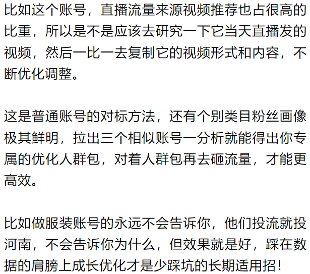 对标数据:开播时间、开播时长、单场直播数据后台的粉丝画像(不要看整体的粉丝画像)、男女比例、观众年龄比例、直播流量来源、观众地域来源。