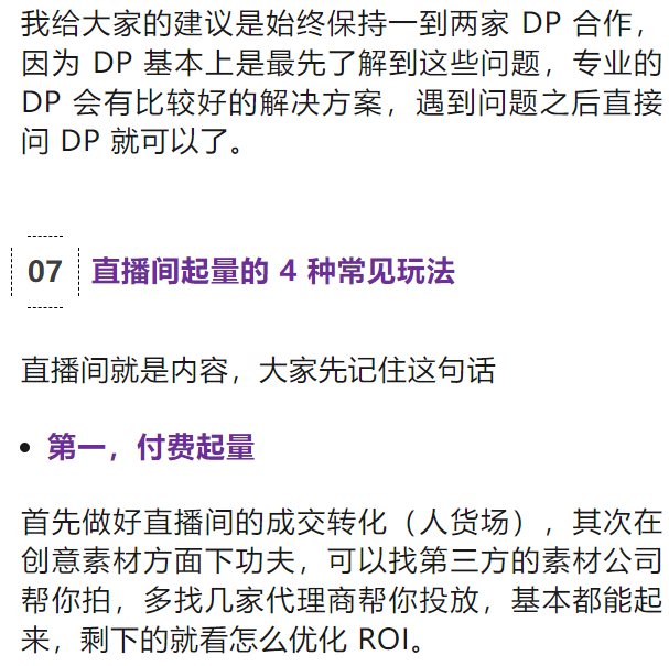 直播带货的成功与否,核心竞争力是人货场,也就是你的直播间+产品,至于投放还是可以交给 DP/代理商/官方投手帮你投放。