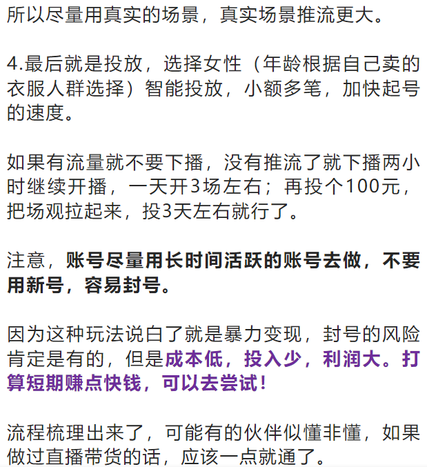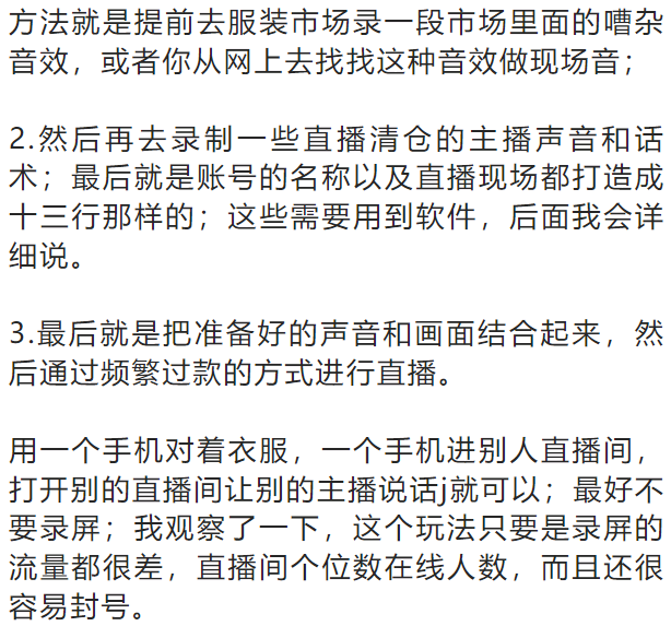 还有一些是直接录播13行服装市场在抢货的现场视频(但是录播的玩法现在已经不行了,进入率特别低,直播间在线人数都很低,而且风险也很大)。