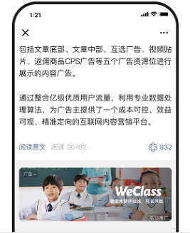底部广告:开通流量主后,发布文章或视频,底部会自动出现一条广告,并且广告千人千面,系统会自动根据用户的行为兴趣展示不同的广告;