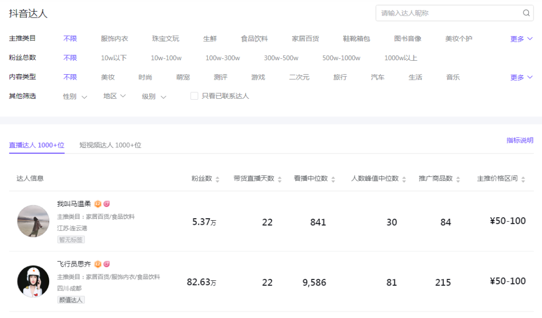 如图所示,可以根据主推类目、内容类型找达人,每一个达人的粉丝数、推广商品数、直播间人气等都很详细。