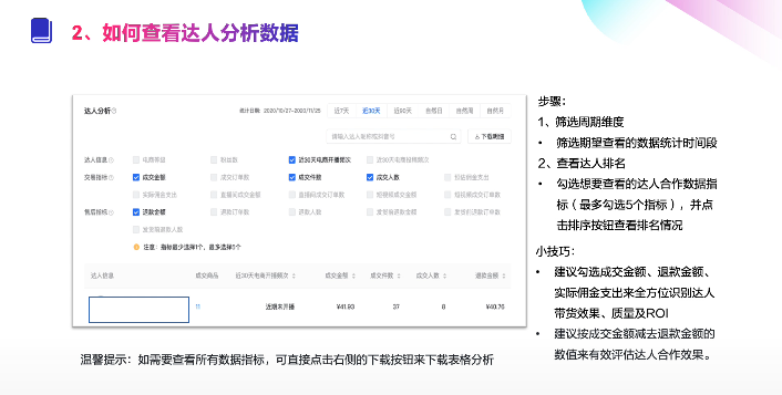 从达人的成交金额、退款金额、所带货商品的佣金率等来分析该达人的带货效果。