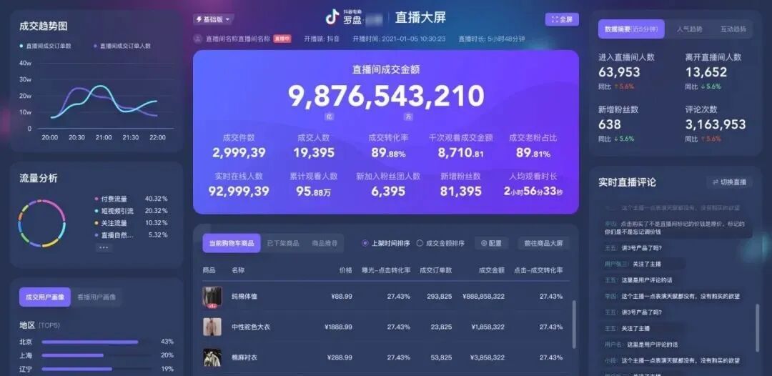 当一个新账号第一次开直播,或前几场开播时,直播间的流量是很少的,一场直播的总场观也就100-500之间,并且这些流量质量很差,这些流量的来源基本是同城、关注、刚注册抖音的用户,没有历史购物记录或低客单的人群。