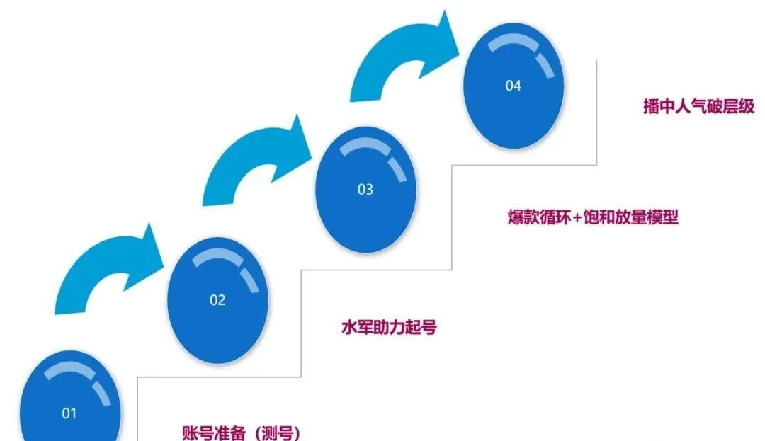 最后总结一下冷启动阶段起号实操:账号准备测号、水军助力起号、爆款循环+饱和放量模型、播中人气破层级。