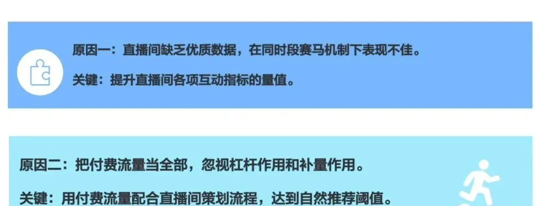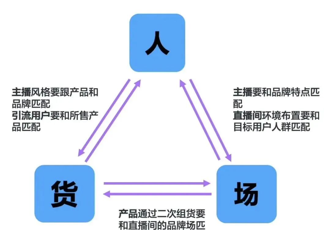 还有在冷启动阶段也常有的一个问题就是人货场匹配的问题。人货场不匹配导致接不住免费流量和付费流量,抖音电商是兴趣电商,兴趣直播间的本质是把合适的产品通过直播间推给合适的用户。这里合适的用户就是指人,合适的产品就是货,直播间就是场,这就是人货场。付费投放只是锦上添花,直播间的细节运营才是影响转化的关键。