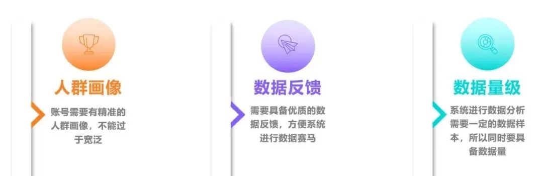 这时我们在冷启动阶段要做人气数据和电商数据,度过冷启动期的必要条件:账号需要有精准的人群画像,不能太泛,需要具备优质的数据反馈,方便系统数据赛马,系统进行数据分析需要一定的数据样本,同时要具备数据量。