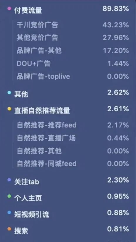 比如下面的流量截图,可以在直播大屏上面直接看到,付费流量占比高达近90%。这就是一个不健康的直播间,也是我们账号冷启动阶段常见的问题。