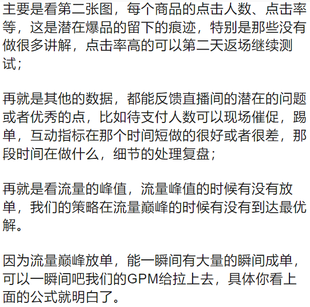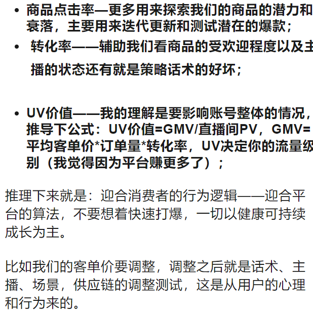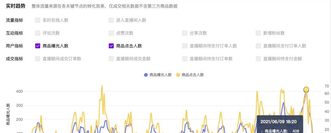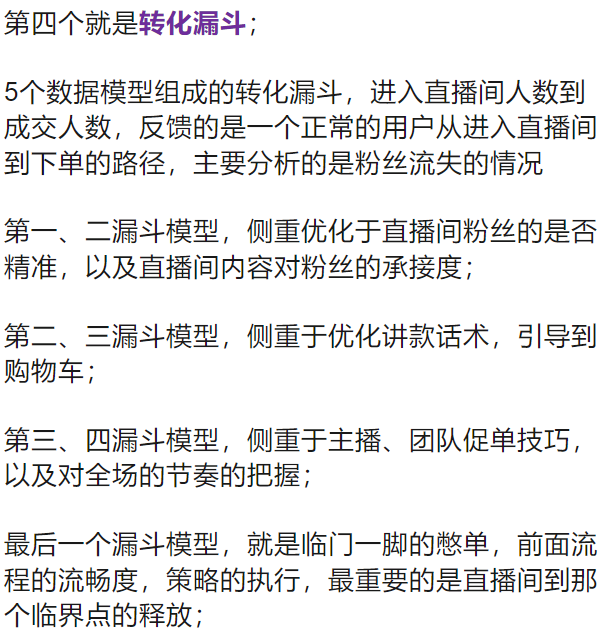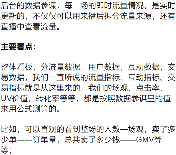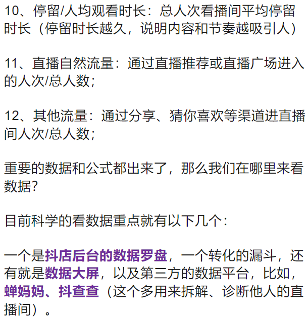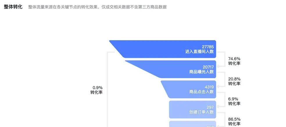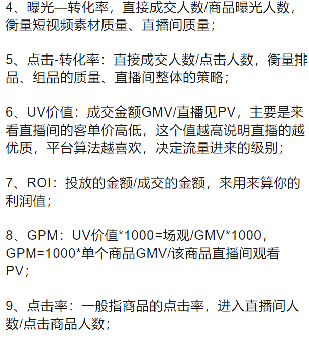 3、转化率,一般指进入直播间的人数和下单人数的比例,衡量“人货场”的指标;