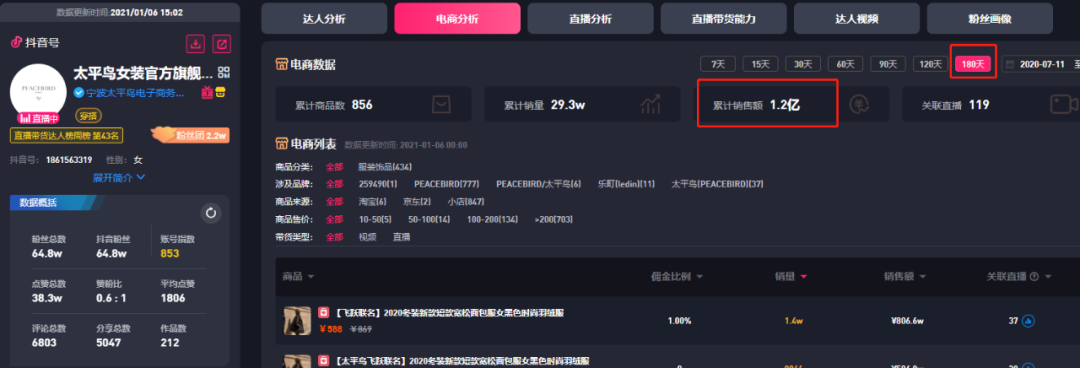 近半年,直播总销售额1.2亿。