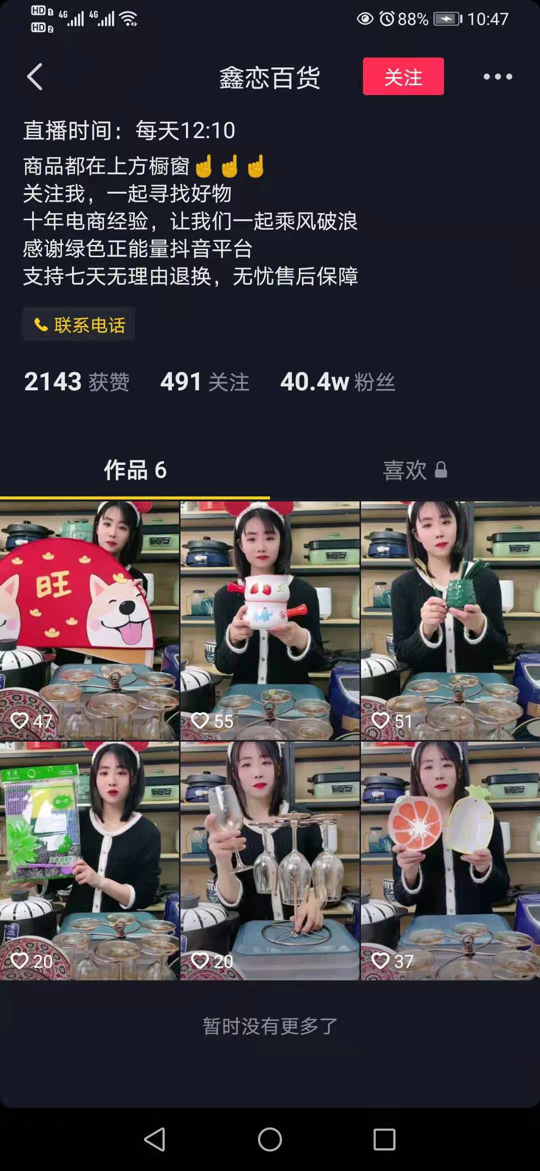 这个叫”鑫恋百货“的帐号,直播间在线峰值700+,粉丝40万+,作品只有可怜巴巴的6个。