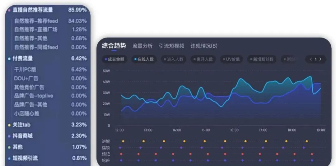 盯完极速流之后,把重点放到直播间各渠道进人情况,可以通过直播大屏的流量来源和流量趋势看到数据。