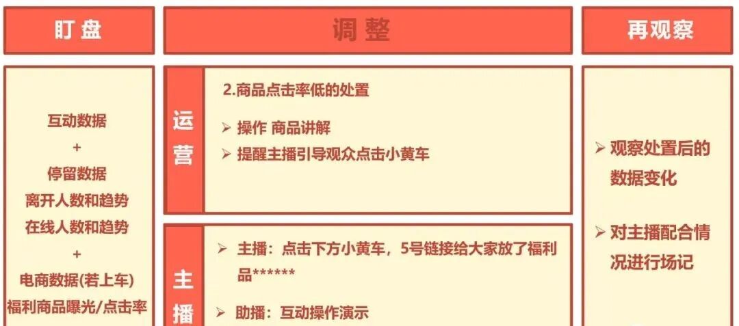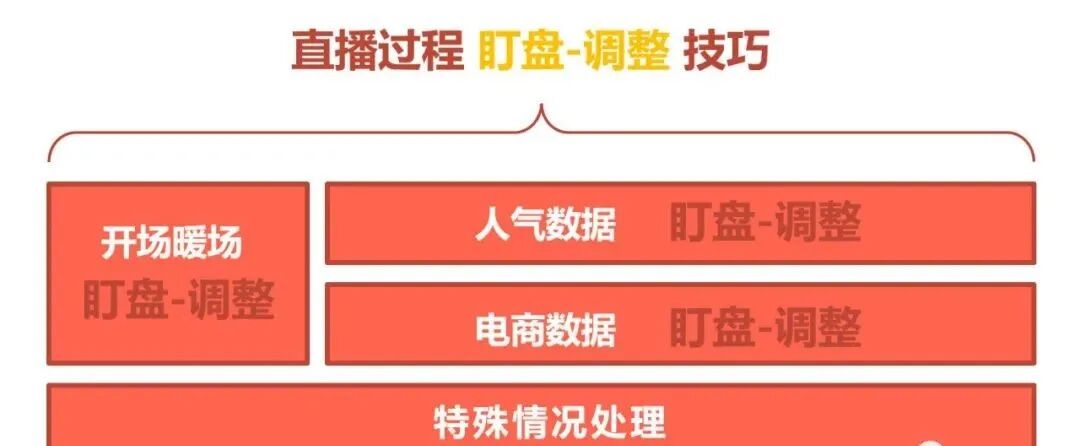 直播的整个过程中都需要盯盘和调整的操作技巧。我们可以把直播过程盯盘调整技巧分为四个阶段:直播暖场阶段盯盘调整、人气数据的盯盘调整、电商数据的盯盘调整、特殊情况盯盘调整处置预案。