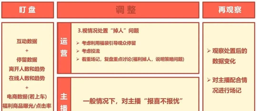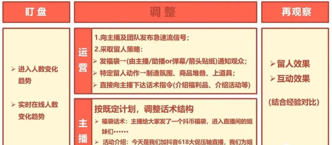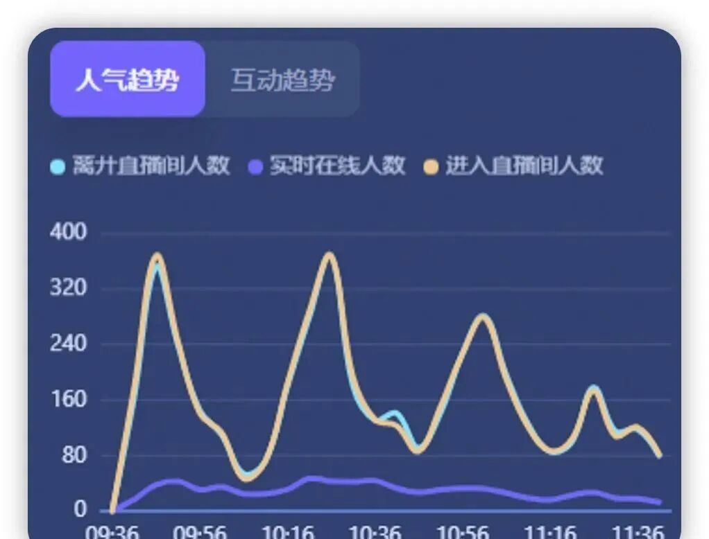 盯盘数据:进入人数变化趋势、实时在线人数变化趋势。调整操作:主要是运营和主播配合,再观察:留人效果、互动效果。