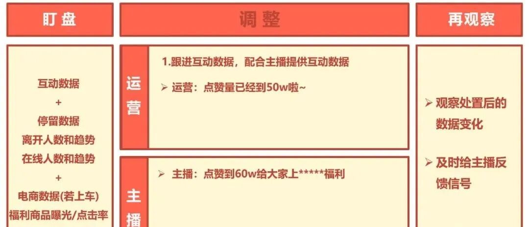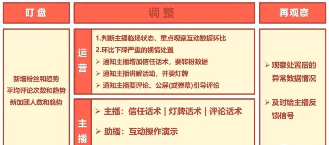 这时的盯盘过程:盯盘粉丝、评论、加团数据,调整主播互动话术、转粉话术、引导评论数据。