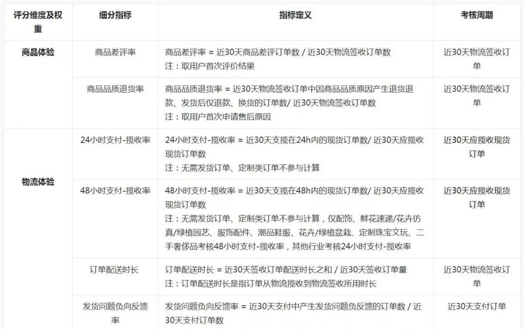 新版体验分为百分制:最低为50分,最高为100分。由商家近30天内的商品体验、物流体验和服务体验三个评分维度加权计算得出。