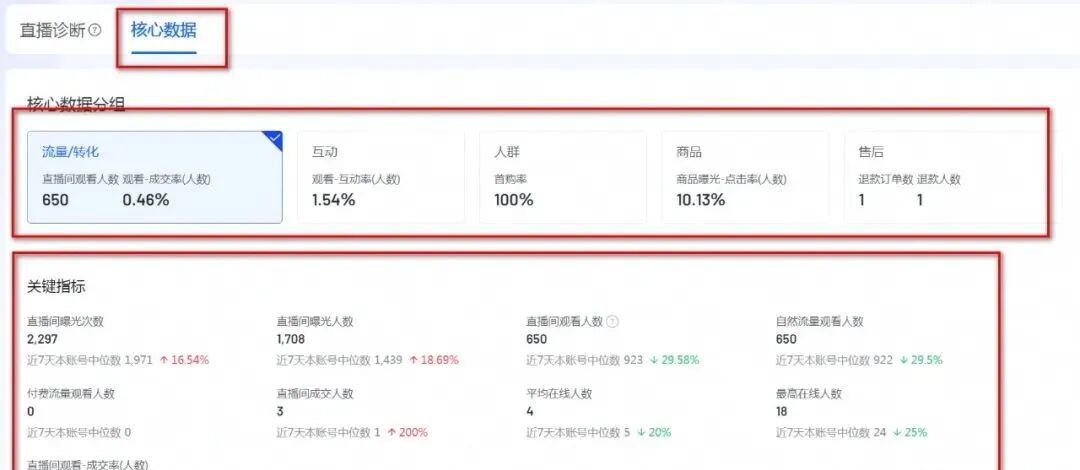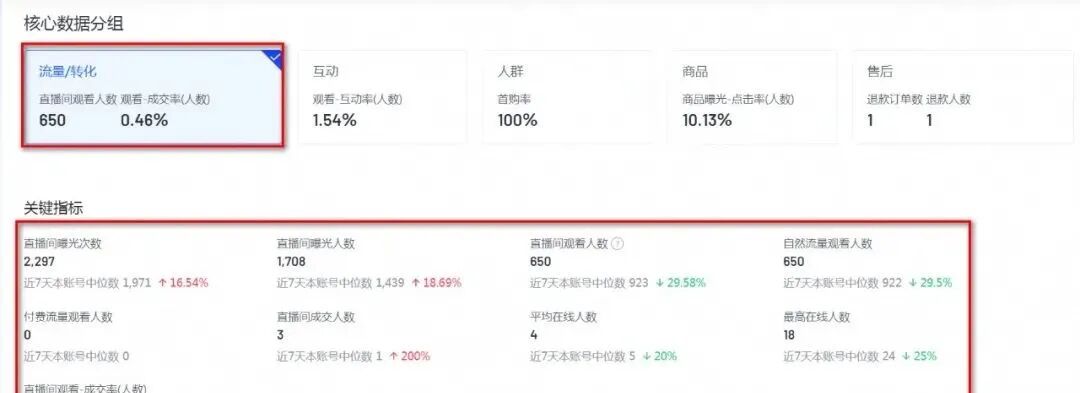 我们打开直播列表,可以点击每场直播详情,可以看到本场直播的核心数据。有核心数据分组数据和关键指标数据,对应的核心数据选择不同,关键指标也不通过。
