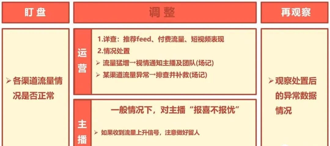 这个阶段盯盘重要要放在:开播极速流情况、各渠道流量情况、主播引导互动情况、讲解福利/活动情况。