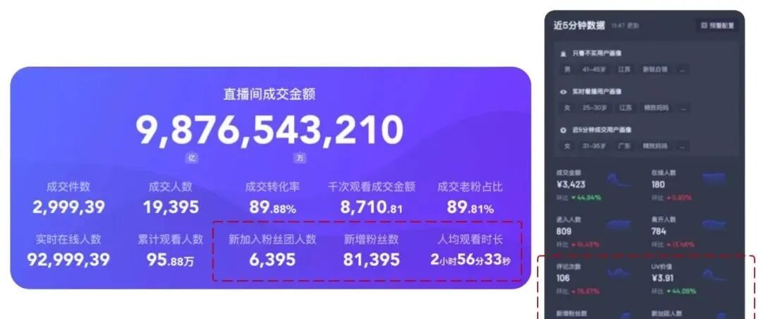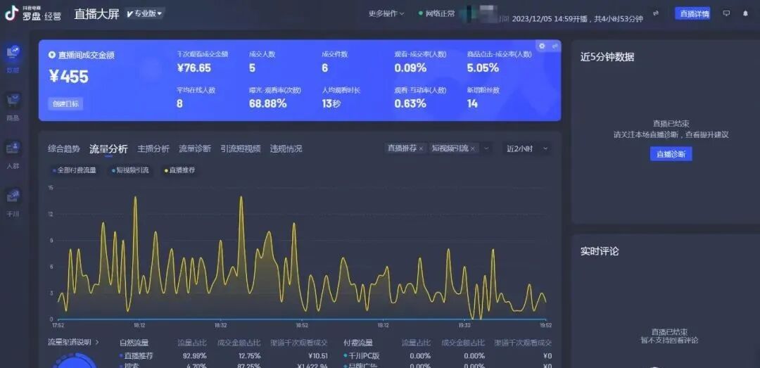 使用专业版直播大屏需要多关注5分钟数据板块。