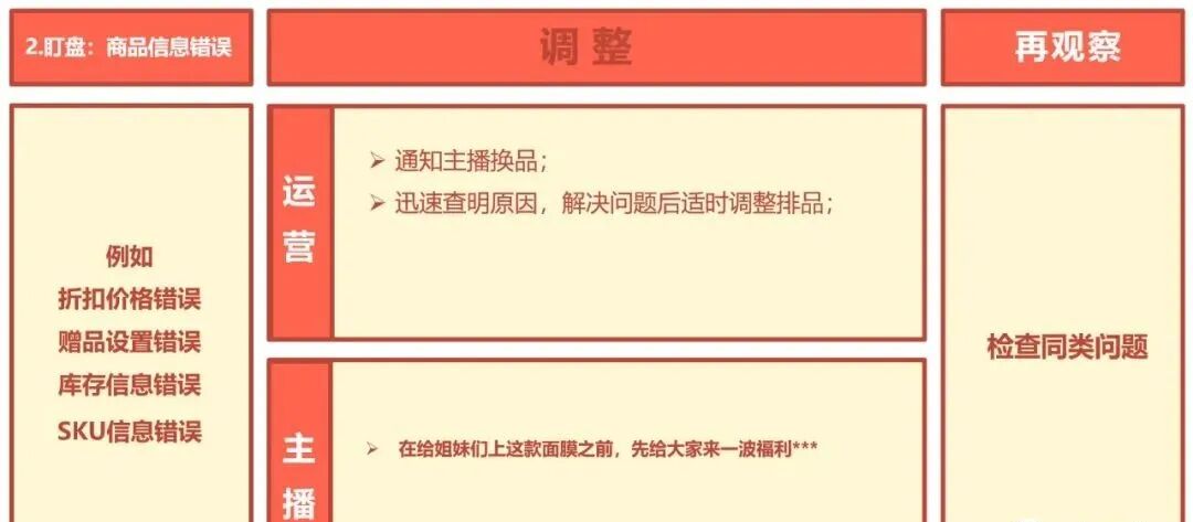 出现商品错误信息时运营不要马上调整,正确的做好是通知主播换品,迅速查明原因,解决问题后适时调整排品。主播话术转品,比如上一波福利,运营同样要检查同类问题是否存在,比如商品折扣、赠品等等。