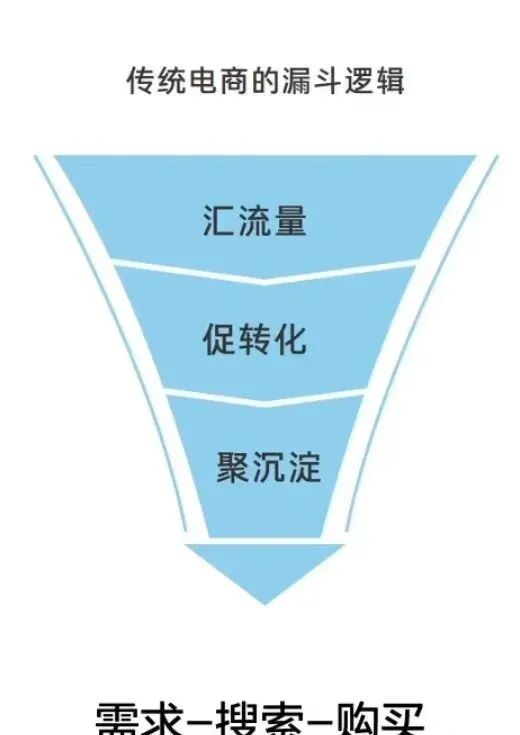 传统电商运营转化用户常用的是漏斗逻辑。简单来说就是有更多的流量进来,是因为用户有某些具体的购物需求,这部分用户大部分都是搜索进来的用户。这里会有一部分用户选择关注你成为粉丝,另外一部分用户最终的核心是有明确的购物需求,然后从搜索到购买的过程。也就是说传统电商的漏斗逻辑是:需求-搜索-购买。