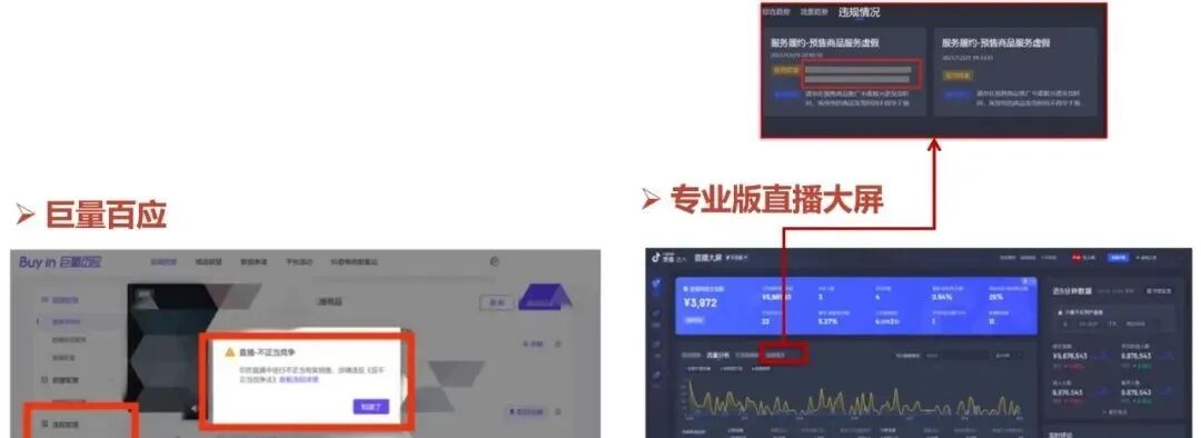 另外在巨量百应的达人工作台也会实时的收到违规提醒。在专业版直播大屏也会看到违规的详细情况:处罚结果和修改建议。